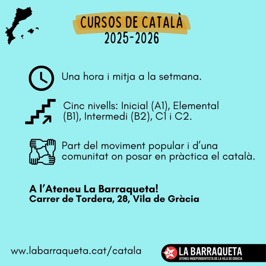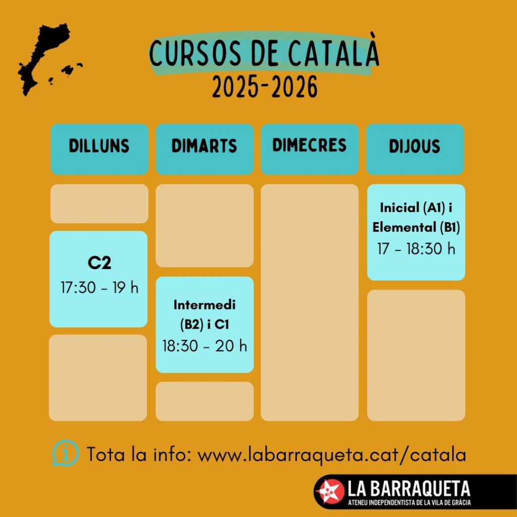 Els cursos començaran la setmana del 13 d’octubre de 2025*. En el cas dels nivells C1 i C2 les classes acabaran la setmana abans dels exàmens oficials de la Generalitat de Catalunya (habitualment durant els mesos de maig i abril, respectivament). En el cas de la resta de nivells, els cursos acabaran a finals de maig.Com puc saber el meu nivell? Si tens dubtes sobre el teu nivell, et proposem que facis la prova d’autoavaluació del web parla.cat (passos a seguir per fer la prova) o la prova de nivell que proposa la Universitat Pompeu Fabra (n’hi ha una per a nivells entre A1 i B2 i una altra per a nivells C1 i C2). Un cop tinguis el resultat, ens el pots enviar per mail a ateneu@labarraqueta.cat.